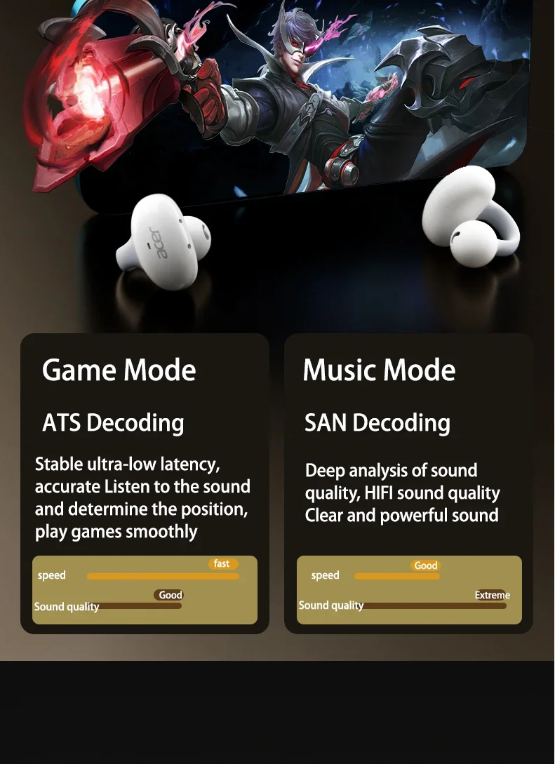 Experience your audio like never before with the Acer SoundFlow wireless earphones. Designed for those who are always on the move, these earphones give you complete freedom with a secure, clip-on fit that stays put through any activity. Immerse yourself in rich, dynamic Dolby Sound, and don't let a drop of rain or sweat hold you back, thanks to the IP5 waterproof design. With seamless Bluetooth connectivity and a microphone for crystal-clear calls, the Acer SoundFlow is your perfect companion for work, play, and everything in between.
